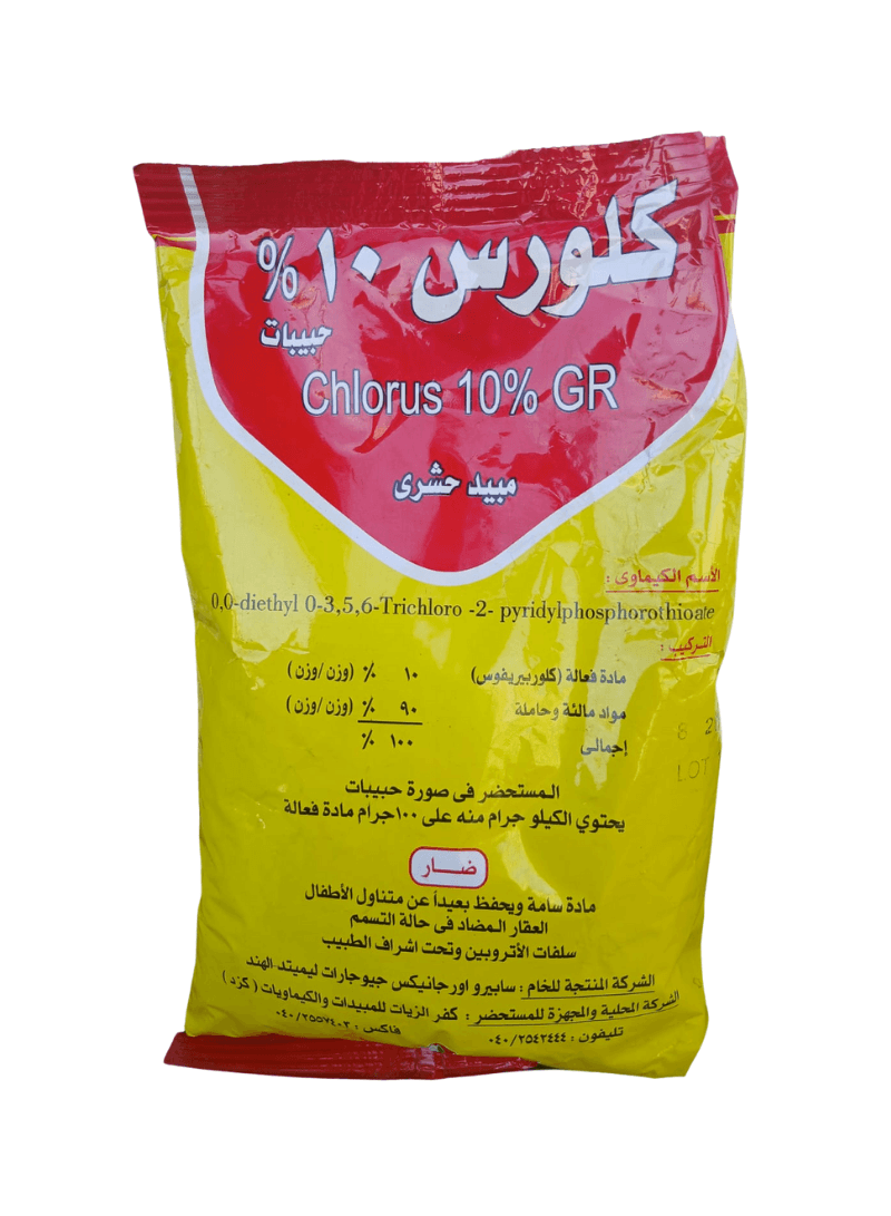 كلورس 1: هو مبيد حشري فسفوري عضوي في صورة محببات (GR)، يحتوي على المادة الفعالة كلوربيروفوس بتركيز 10%. يعمل بكفاءة عالية عن طريق الملامسة، والابتلاع، وكأبخرة سامة تقضي على الحشرات المختبئة في التربة.